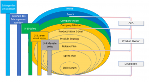 OKRs sind i.d.R. festgelegt für 3-4 Monate und ggf. eingebunden in in Jahresziele (MOALS = Midtermed Goals). Sie können untergeordnete Initiativen umfassen, eigene kleinere Tasks, aber auch in den OKR-Zeitrahmen integrierte Scrum-Sprints. Für die Gesamtlebensdauer des Unternehmens kann dies die „Planungszwiebel“ vollumfänglich beschreiben: